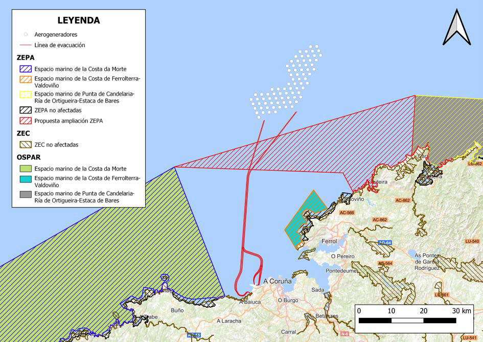 Aparte de sus valores naturales y ornitológicos, la organización considera que deben suspenderse este y el resto de parques eólicos marinos proyectados en tanto no se aprueben los Planes de Ordenación del Espacio Marítimo (POEM) de las Demarcaciones Marinas, para asegurar el ajuste a las condiciones que establezcan estos. No en vano, en junio de 2021 a través del Real Decreto-ley 12/2021 se aprobó la suspensión de nuevas tramitaciones de eólica marina hasta la aprobación por el Gobierno de un nuevo marco normativo para las instalaciones de generación de energía eléctrica en el mar territorial, reconociendo la necesidad de ordenar con más garantías el desarrollo de estas instalaciones.